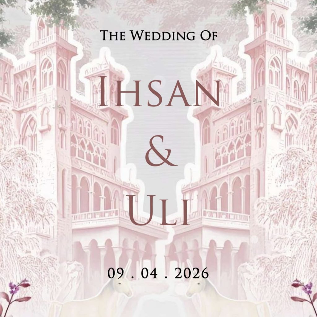 Wedding Invitation Ihsan & Uli Kepada Bapak/Ibu/Saudara/i : Tamu Undangan Buka Undangan The Wedding Of Ihsan & Uli 09 . 04 . 2026 We Found Love وَمِنْ اٰيٰتِهٖٓ اَنْ خَلَقَ لَكُمْ مِّنْ اَنْفُسِكُمْ اَزْوَاجًا لِّتَسْكُنُوْٓا اِلَيْهَا وَجَعَلَ بَيْنَكُمْ مَّوَدَّةً وَّرَحْمَةً ۗاِنَّ فِيْ ذٰلِكَ لَاٰيٰتٍ لِّقَوْمٍ يَّتَفَكَّرُوْنَ ” Dan di antara tanda-tanda kekuasaan-Nya diciptakan-Nya untukmu pasangan […]