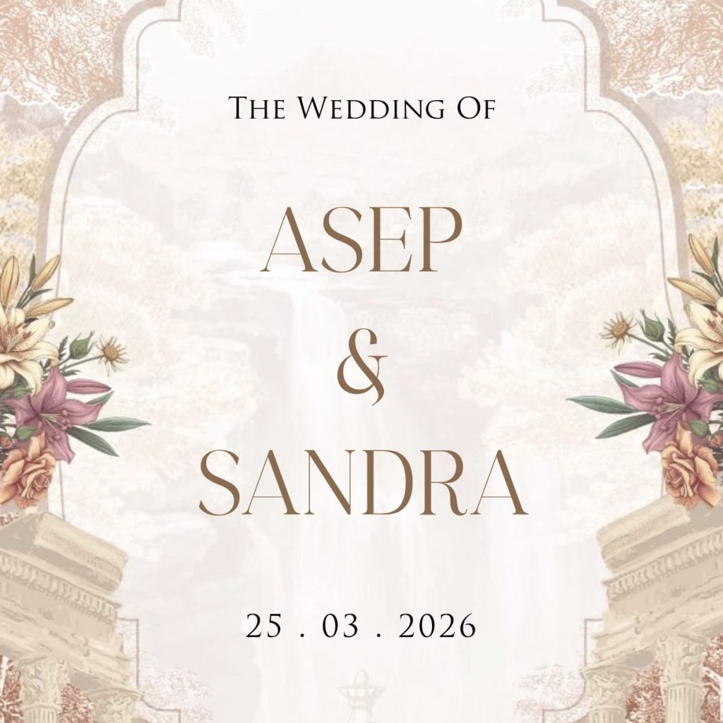 A | S Wedding Invitation Asep & Sandra Kepada Bapak/Ibu/Saudara/i : Tamu Undangan Buka Undangan The Wedding Of Asep & Sandra 25 . 03 . 2026 وَمِنْ اٰيٰتِهٖٓ اَنْ خَلَقَ لَكُمْ مِّنْ اَنْفُسِكُمْ اَزْوَاجًا لِّتَسْكُنُوْٓا اِلَيْهَا وَجَعَلَ بَيْنَكُمْ مَّوَدَّةً وَّرَحْمَةً ۗاِنَّ فِيْ ذٰلِكَ لَاٰيٰتٍ لِّقَوْمٍ يَّتَفَكَّرُوْنَ ” Dan di antara tanda-tanda kekuasaan-Nya diciptakan-Nya untukmu pasangan […]